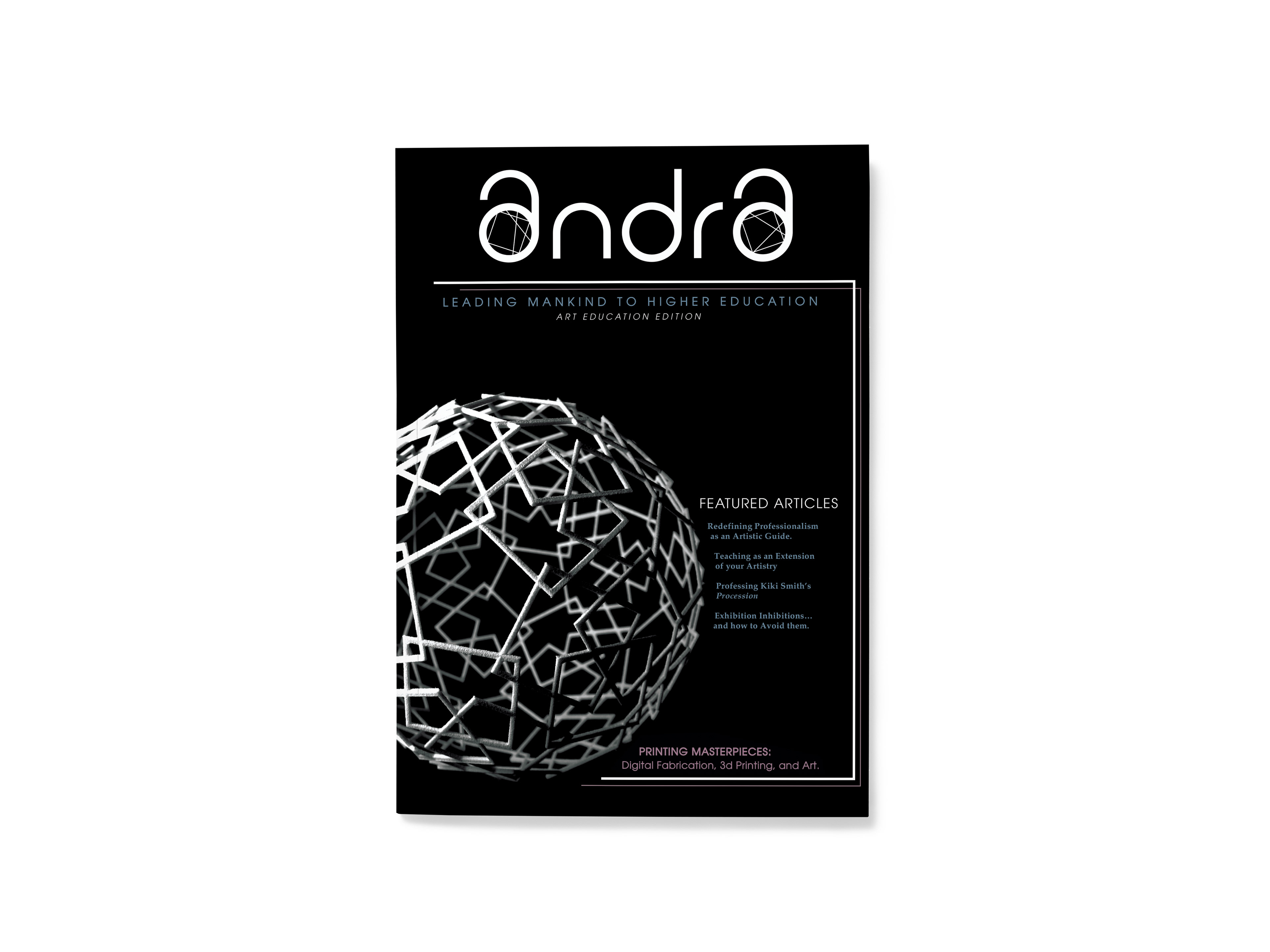 Andra is an educational magazine dedicated to professors wanting to blend their professional lives with their passion for teaching. The main feature “Printing Masterpieces” transports its viewer to an ethereal world of darkness only highlighted by stunning 3D printed artwork in an effort to inspire more incorporation of 3D printing in the classroom. 3D printers bring impossible forms to life, and the layout reflects its dynamic capabilities and captivating science while allowing the work itself to shine.